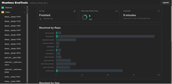 We processed a random set of 20 issues from this dataset and evaluated them using the Moatless-Evaltool (GitHub Link). This tool requires submitting a JSONL file containing each instance and its corresponding AI-generated patch.