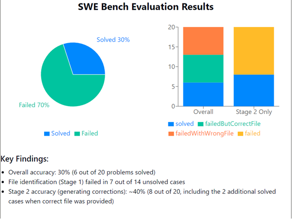 - In this controlled setting, the system correctly resolved 2 out of 7 issues, meaning that Stage 2 (fix generation) had an accuracy of 40% when provided with the correct file.
