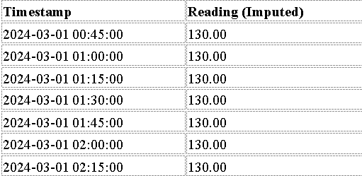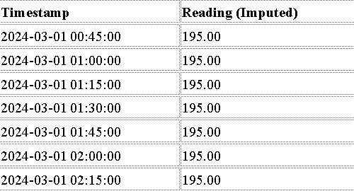 The missing values between 00:45 AM and 02:15 AM are unknown, and the last available value (400 at 02:30 AM) represents the sum of all missing readings in this period. Simply imputing missing values arbitrarily may lead to incorrect distributions and distorted trends, making the data unreliable for predictive modeling.