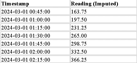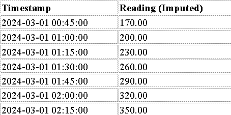 We are working with a dataset containing 10 time intervals of meter readings recorded at 15-minute intervals. However, there are 7 missing values in between, and the last available reading at 02:30 AM is the sum of all missing values.