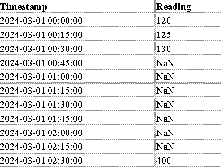 A utility company collected meter readings at irregular intervals. The dataset had missing values for several intermediate timestamps, but the final recorded reading was an aggregated sum of all missing readings in that period. This type of data inconsistency made it difficult to analyze trends and forecast future values accurately.